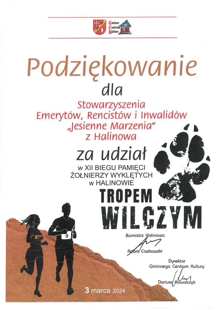 Grupa sportowa jako sekcja Nordic Walking powołana została przez Zarząd Stowarzyszenia i promuje ruch na świeżym powietrzu. Jest integralną częścią Stowarzyszenia Emerytów Rencistów i Inwalidów „Jesienne Marzenia”. Uczestniczymy w biegach i konkursach takich jak „Bieg Rycerza Okunia”, „Bieg Tropem Wilczym Pamięci Żołnierzy Wyklętych”. Mamy swoje osiągnięcia w tych biegach. Często nas spotkasz w grupach na ścieżkach naszej okolicy.